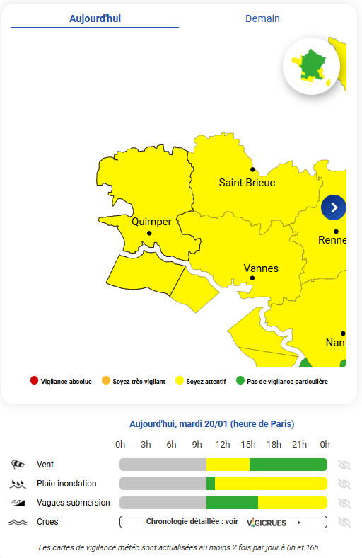Les forts vents de secteur Sud-Ouest sont accompagnés de fortes vagues au sud de la Bretagne. De plus, les conditions atmosphériques sont à l’origine d’une surélévation du niveau de la mer (surcote), se rajoutant à des niveaux marins relativement élevés (coefficient 83 pour la pleine mer de fin de journée). La conjonction de ces niveaux marins élevés et de ces fortes vagues risque d’engendrer des submersions par franchissement de paquets de mer sur les zones exposées du littoral du département. Le risque est plus marqué au moment de la pleine mer (Pleine mer 17h52 à Concarneau).
