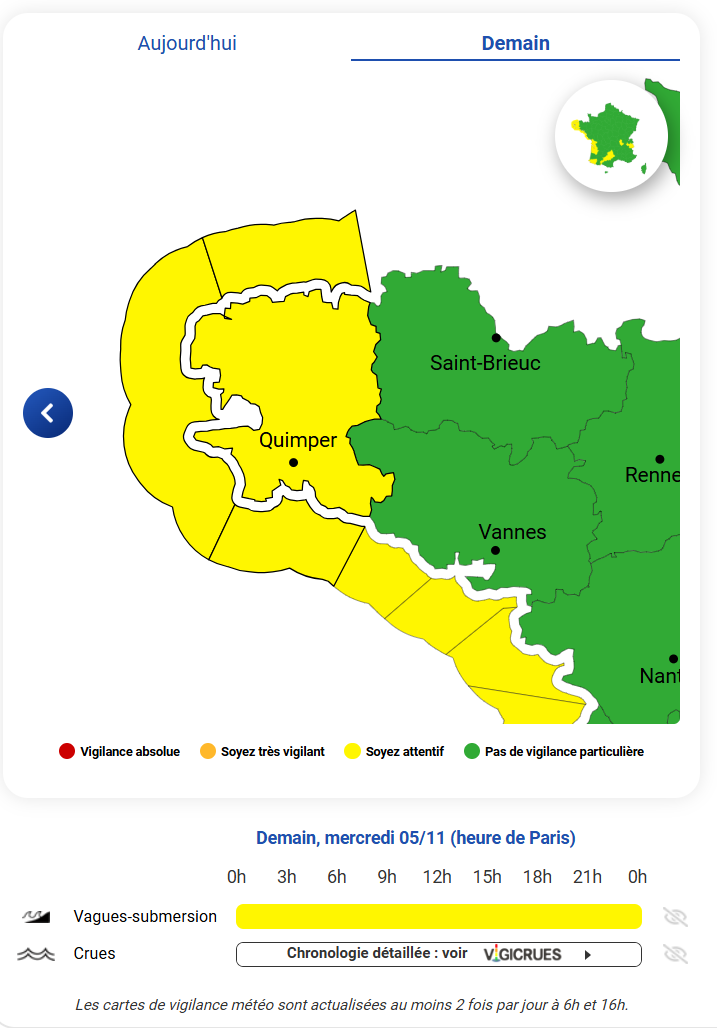 La préfecture du Finistère maintient la vigilance jaune vagues submersion le mercredi 5 novembre.