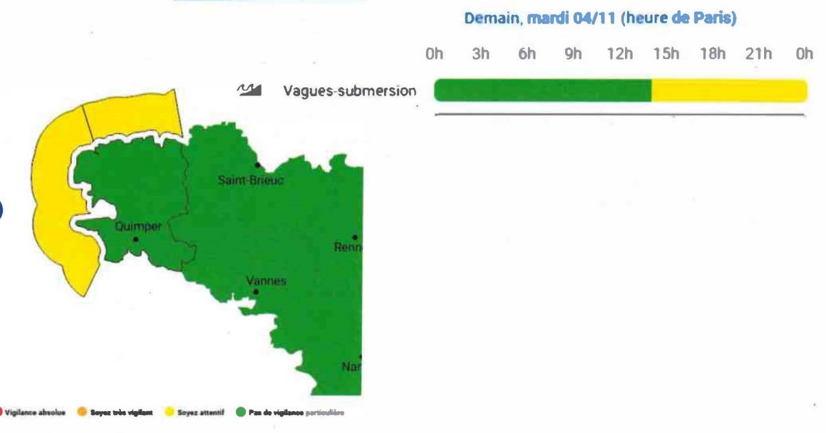 Le département est placé en vigilance jaune pour le phénomène de vagues submersion pour la journée de demain, mardi 4 novembre 2025 à partir de 14h.