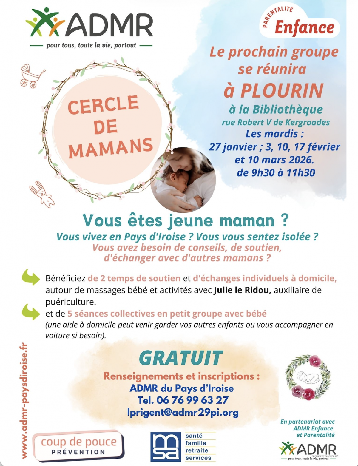 Ce cercle de mamans, animé par Julie Le Ridou, auxiliaire de puériculture, a pour objectif de prévenir le risque d’épuisement des jeunes mamans, en apportant un soutien social notamment pour les mamans isolées ou n’ayant pas de famille à proximité.