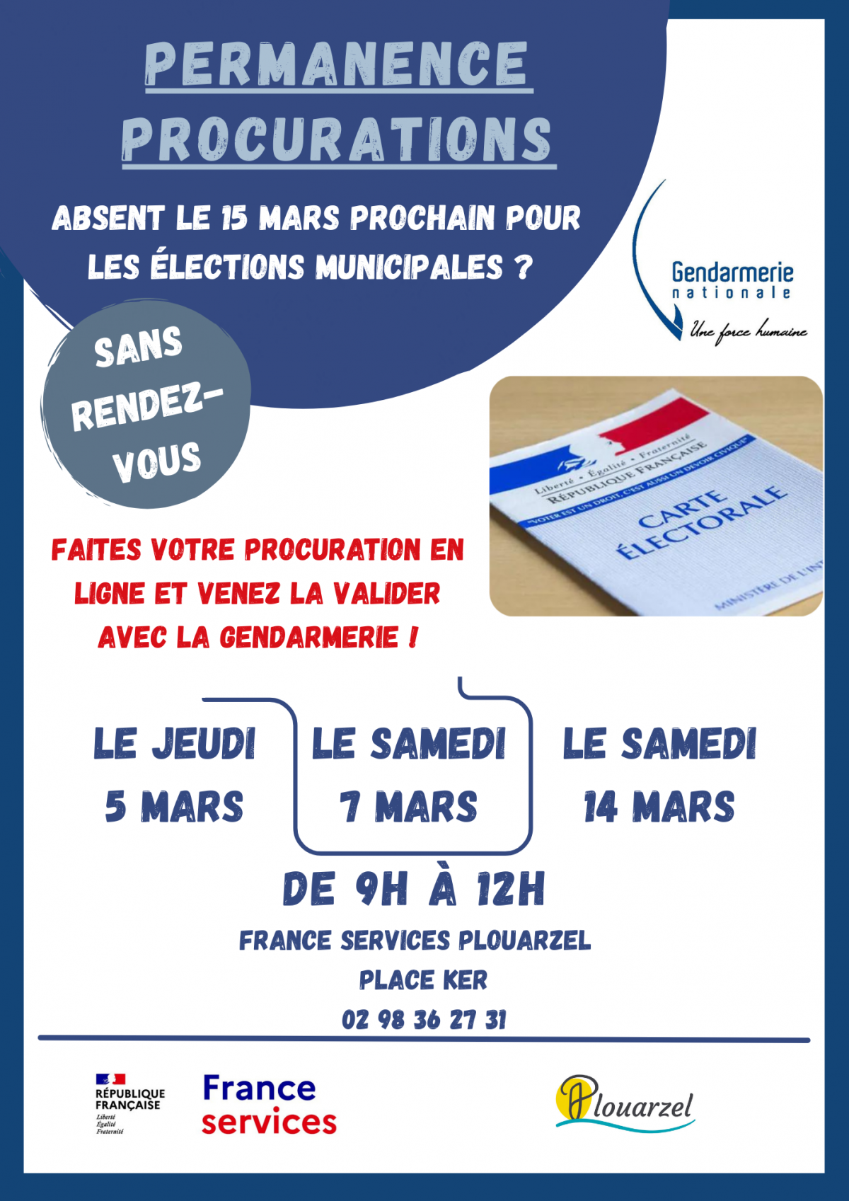 Si vous ne pouvez pas vous déplacer pour voter, vous pouvez établir une procuration de vote en faveur d’un autre électeur, inscrit ou non sur Locmaria-Plouzané.