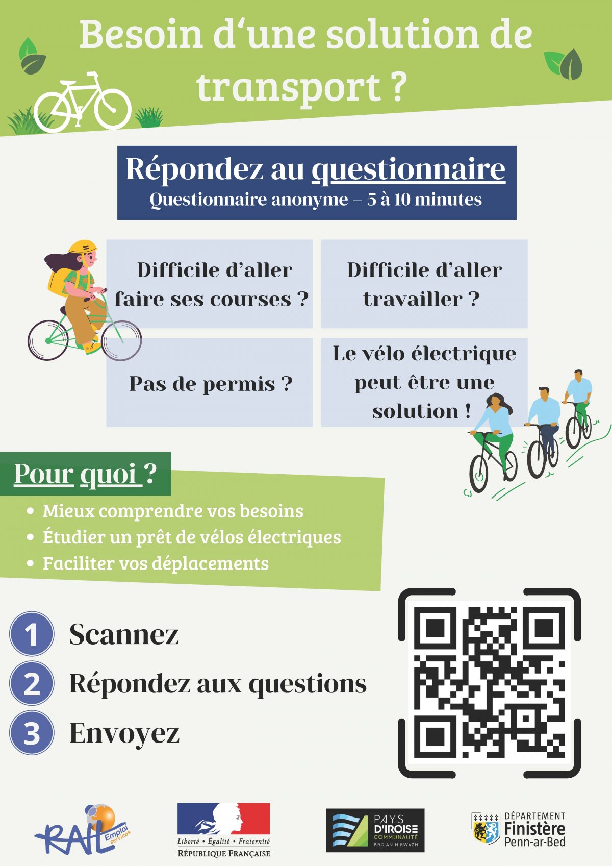 Pour mieux comprendre les besoins et les difficultés liés à la mobilité sur le Pays d’Iroise, un questionnaire d’une vingtaine de questions est disponible. Pour y répondre scannez le QRCODE de l’affiche ou sur le lien suivant :