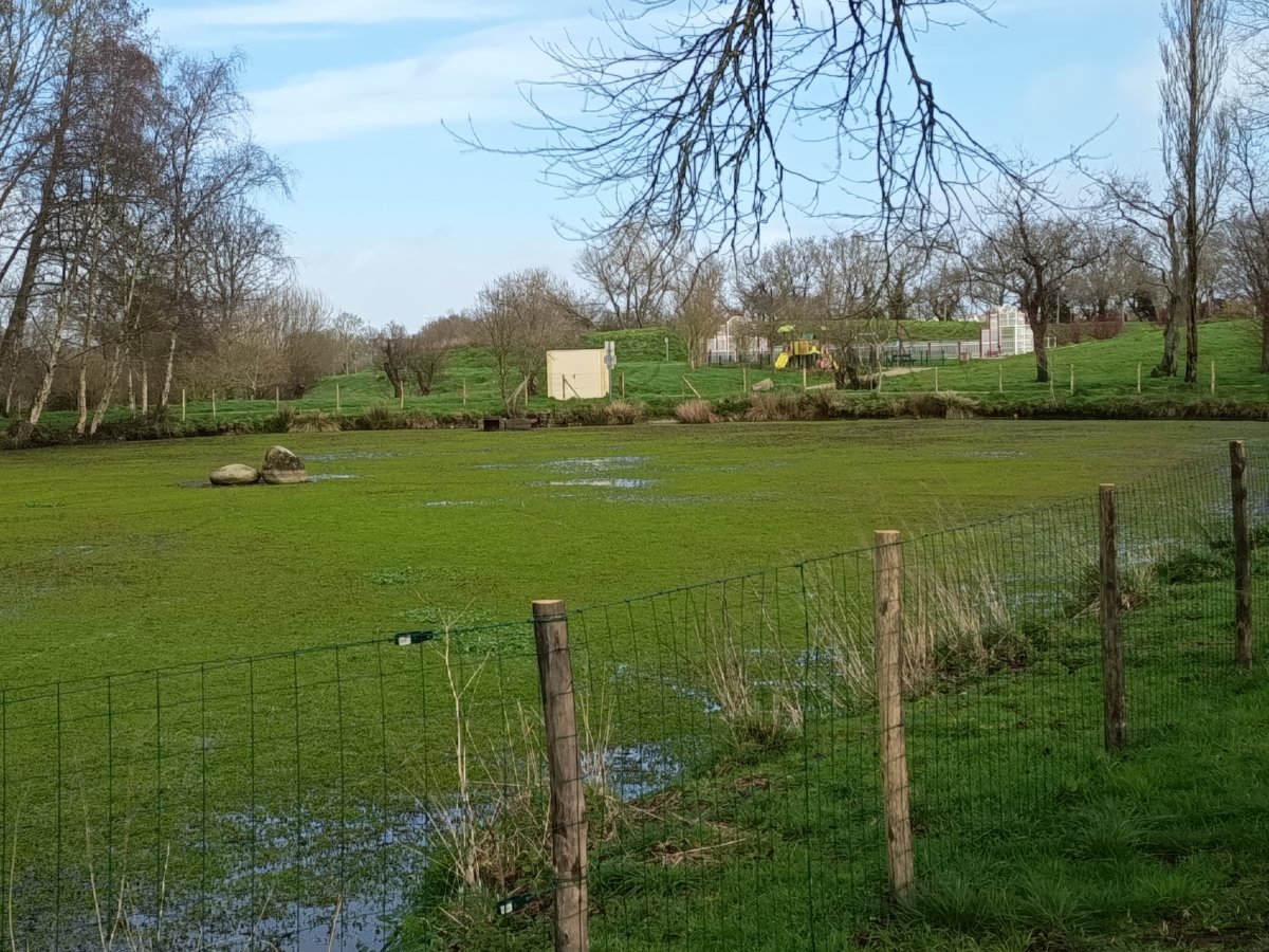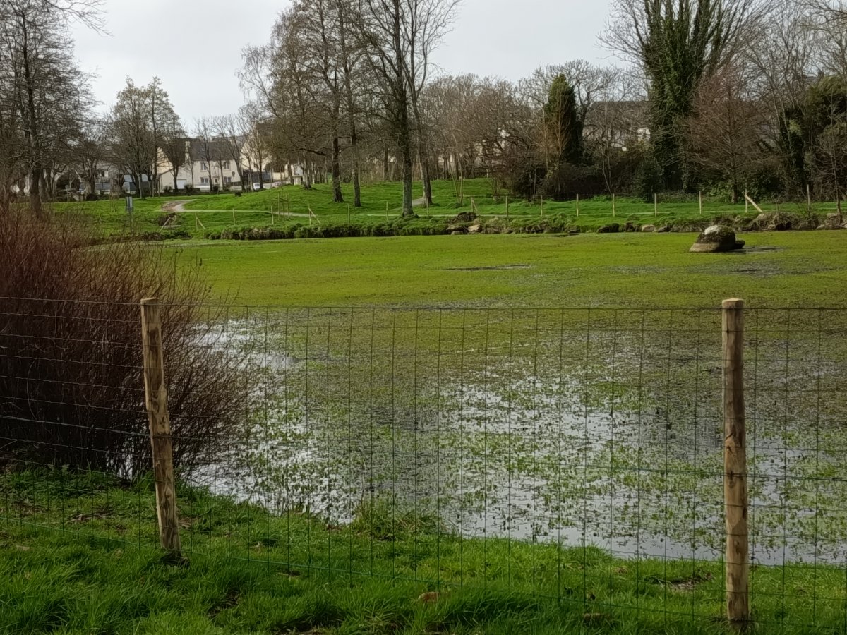 Le plan d’eau est envahi par une plante aquatique invasive, dont la prolifération rapide perturbe l’équilibre naturel du site. Face à cette situation, une protection grillagée a été installée par les services techniques de la commune afin de sécuriser les abords (éviter la confusion entre les berges et le plan d’eau recouvert de cette plante).