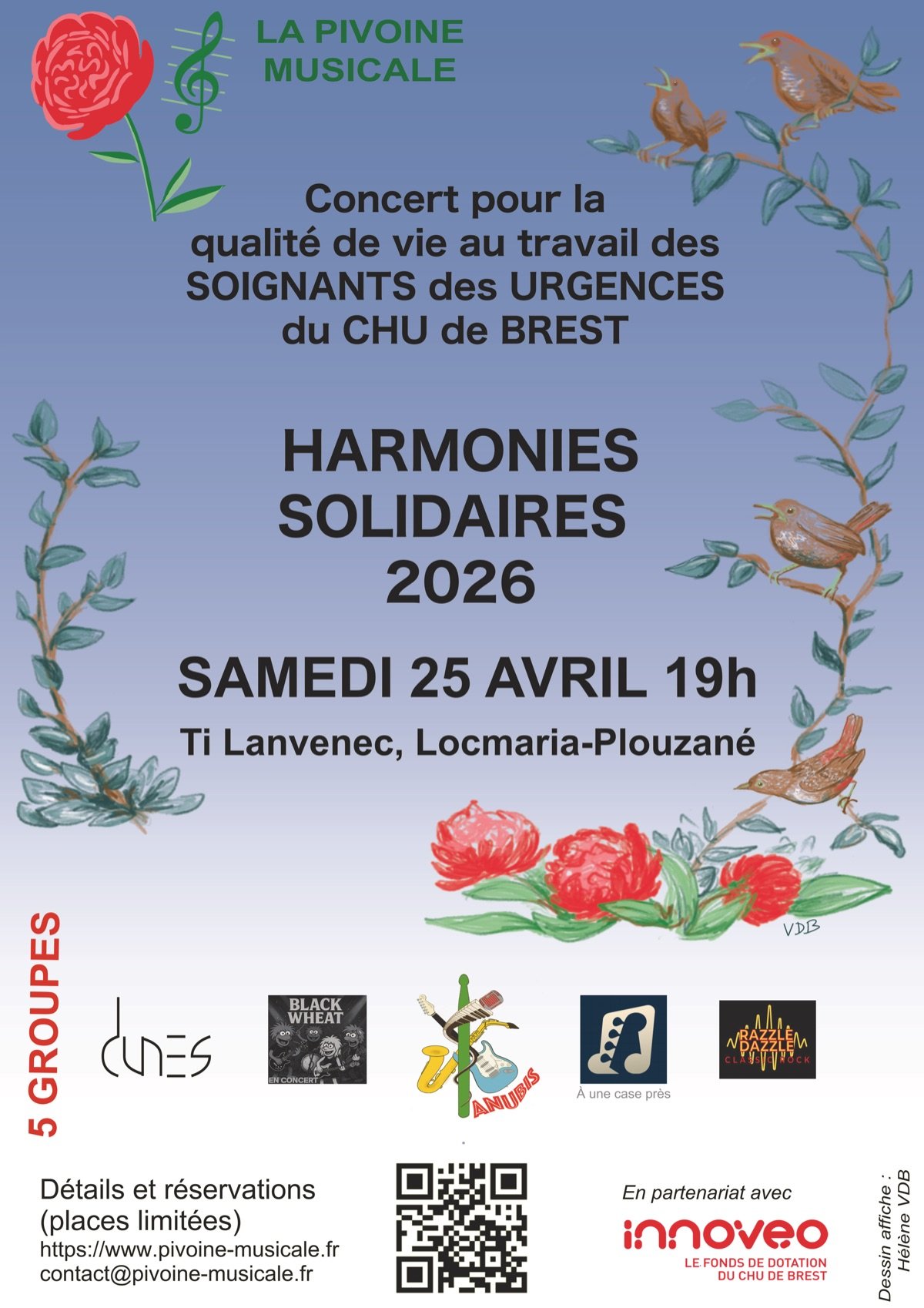 Organisées par l’association la Pivoine Musicale, les Harmonies Solidaires ont pour objet de contribuer à la qualité de vie des soignants en CHU ou en EHPAD. Après une première édition réussie en 2025 au profit des soignants d’urologie et de radiothérapie, l’association vous invite à participer à l’édition 2026 le 25 avril 2026 à 19h à Ti Lanvenec. Organisé en partenariat avec Innoveo, la ville de Locmaria Plouzané et Ti Lanvenec, l’entrée et le buffet sont gratuit. Un don libre vous permettra de soutenir les équipes des Urgences du CHU dont on connaît le dévouement et l’humanité. Réservez la date!